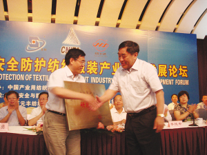 中国纺织工业协会副会长王天凯(右)向陕西元丰纺织技术研究有限公司董事长傅恩福颁发“中国安全与防护用纺织品研发基地” 牌匾。