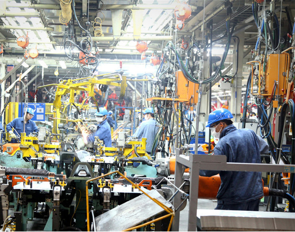 现代化的汽车生产工序已经大量使用焊接机器人来代替人工,但是一些特殊的小部件焊接必须采用人工焊接技术。焊接工作环境存在火花、熔融焊渣和高温热源等危险因素,需要阻燃、抵御熔融焊渣、有一定隔热效果的防护服装,图中是上汽的员工穿着阻燃防护服进行工作。