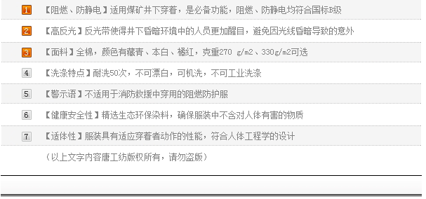 适用煤矿井下穿着,是必备功能,阻燃、防静电均符合国标B级