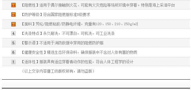 适用于偶尔接触到火花、可能有火灾危险等场所环境中穿着。特别是海上采油平台