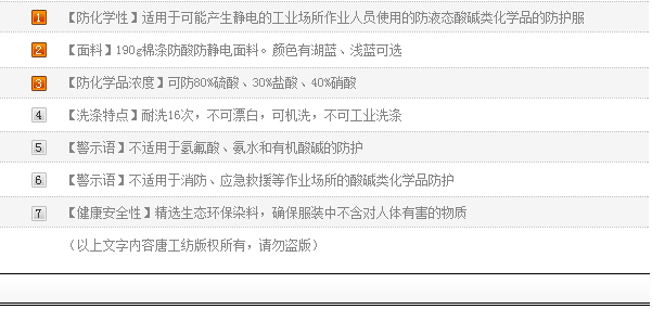适用于可能产生静电的工业场所作业人员使用的防液态酸碱类化学品的防护服