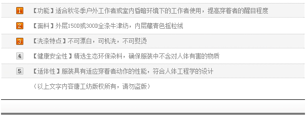 【功能】适合秋冬季户外工作者或室内昏暗环境下的工作者使用,提高穿着者的醒目程度