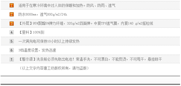 适用于在寒冷环境中对人体的保暖和加热。防风、防雨、透气